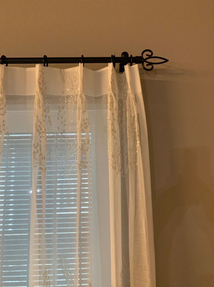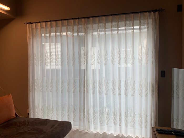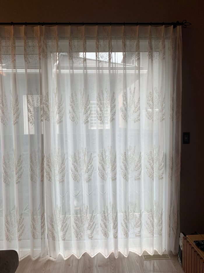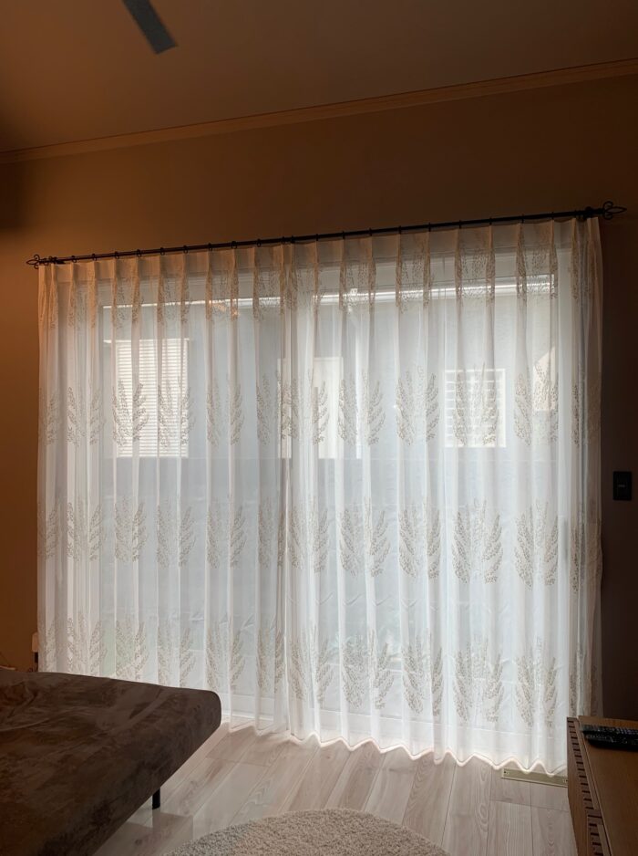リビングの掃き出し窓に刺繍レースカーテン&アイアンレールを取り付けました(^^♪