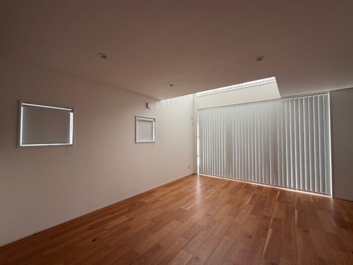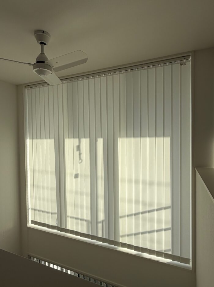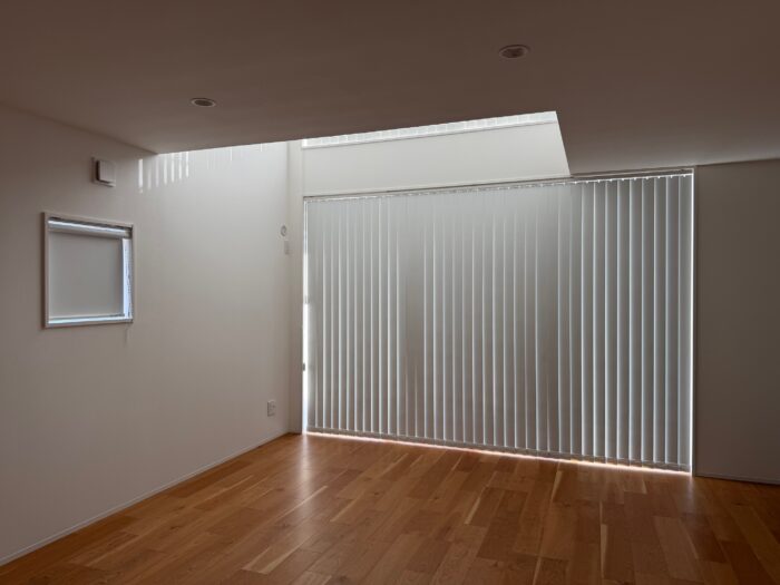 吹き抜け窓にはバーチカルブラインド【タチカワブラインドLD7211】を合わせて取り付けました(^^)/